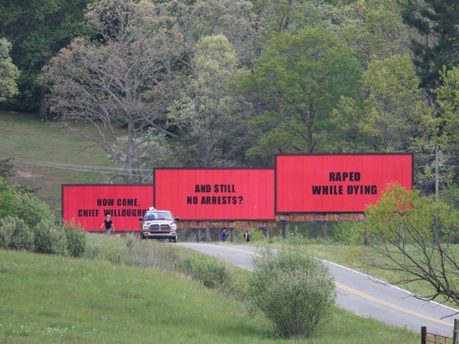 Потеря близких людей может подтолкнуть человека на невероятные поступки. Анжела Хэйз была изнасилована и убита на трассе, ведущей от их дома к границе Эббинга. Главная героиня данной истории является Милдред Хейз мать убитого подростка. Женщина, увидев, что полиция бездействует, решила собственными усилиями раскрыть данное преступление. Основной персонаж явно понимал, что органы власти не хотят заниматься жестоким убийством её дочери. Обливающееся кровью материнское сердце не может оставить в покое счастливо живущий мир. Поэтому ключевая фигура истории пишет оскорбительные фразы на билбордах около отдалённой трассы. Однако жители городка недовольные подобным поведением женщины. Надписи на билбордах создают серьёзные проблемы между пострадавшей и полицией. Несмотря на любые невзгоды Милдред, не собирается сдаваться, ведь смерть собственного чада не дает ей покоя. Сюжет заставляет зрителя задуматься о человеческой сущности, о ценностях общества. Эгоизм некоторых людей поражает зрителей, наблюдающих за событиями, происходящими с Милдред.
